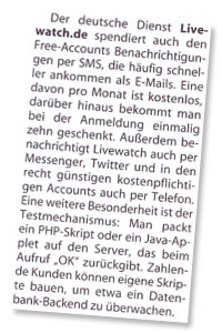 Fazit der c't: "Schnelle Benachrichtigung per SMS erhält man nur von Livewatch.de...[]"