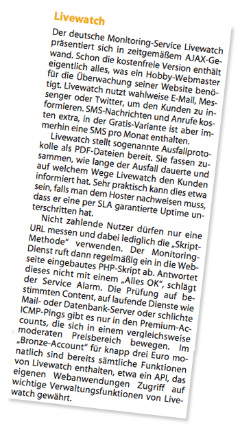 Das Magazin für Computer Technik (c't) testete in der Ausgabe 21/2008 vom 29.9.2008 12 internationale Servermonitoring Dienste. Es schreibt Folgendes über Livewatch.de.